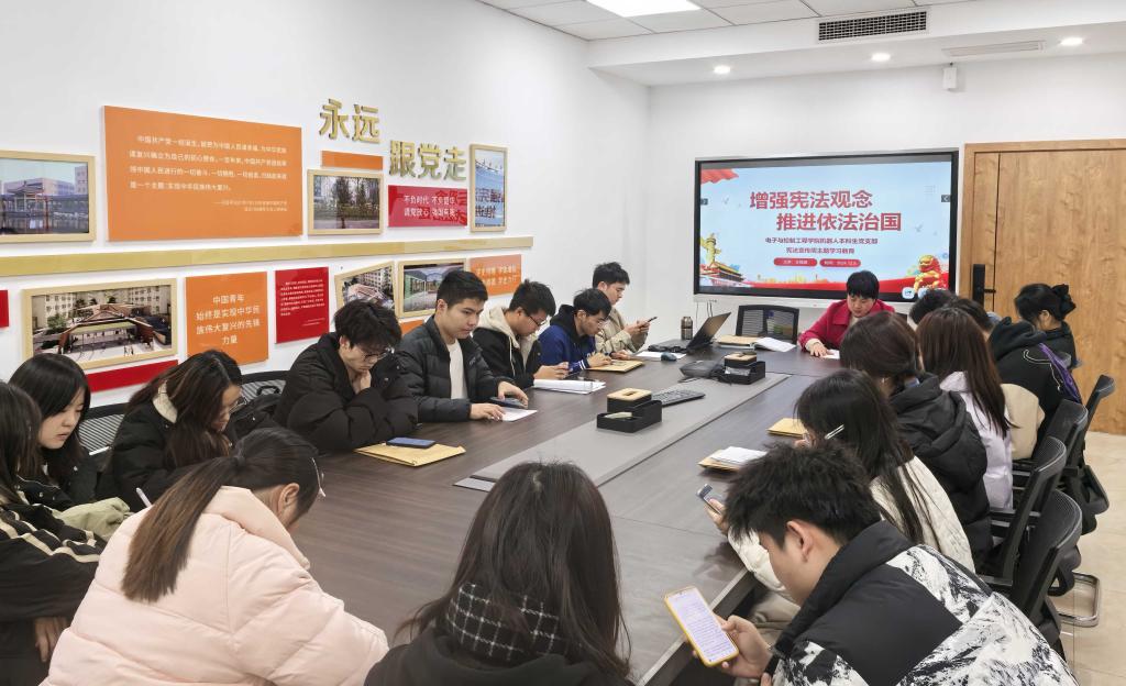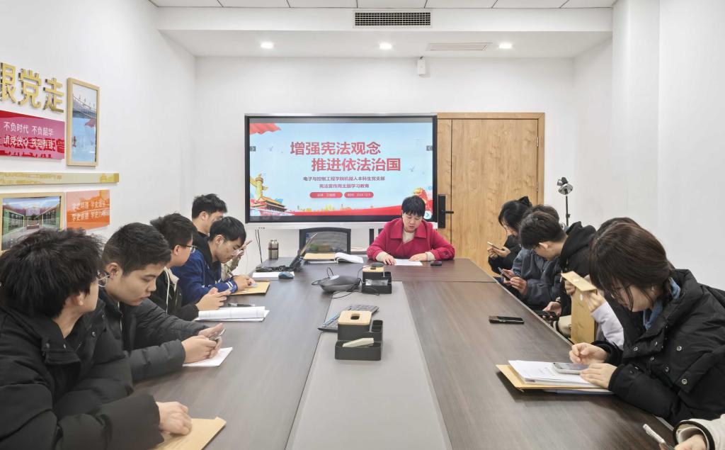 在第十一个国家宪法日到来之际,为深入贯彻落实习近平法治思想,进一步弘扬宪法精神,推进依法治国进程,12月5日,电控学院机器人本科生党支部在朝晖园一站式示范园区党团活动室举办“增强宪法观念,推进依法治国”主题党日活动。党支部书记王斌娟及全体支部党员参加活动。