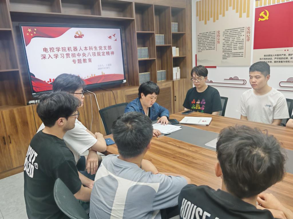 为提高全体党员的政治素养,强化作风建设,一体推进党风廉政建设,进一步深化全面从严治党,电控学院机器人本科生党支部于2025年5月6日在明德园智通大厦327开展深入贯彻中央八项规定精神学习教育。电控学院机器人本科生党支部书记王斌娟及支部全体党员参加会议。