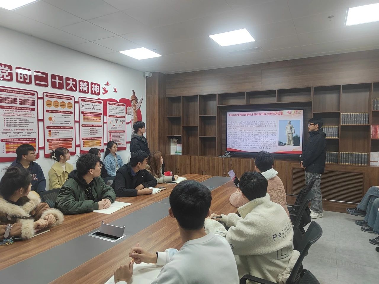 学生党员王学涛向大家分享了革命先烈刘胡兰的故事。刘胡兰自幼投身革命,参加儿童团、妇女工作。1947年1月12日,因叛徒告密被国民党军与地方武装围捕,在敌人的威胁面前,她坚贞不屈,毫无惧色,最终壮烈牺牲于铡刀之下,年仅 15 岁。其英勇事迹彰显了共产党员的崇高气节,成为不朽的革命丰碑,永远激励着后人。