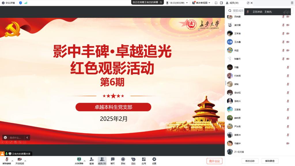 为重温革命先辈的峥嵘岁月,引导学生党员深入了解党的创建历程及伟大建党精神,2月5日,卓越本科生党支部组织开展“影中丰碑 卓越追光”红色观影活动(第6期),活动组织全体党员集中观看以中国共产党建党历史为背景的影片一一《1921》。