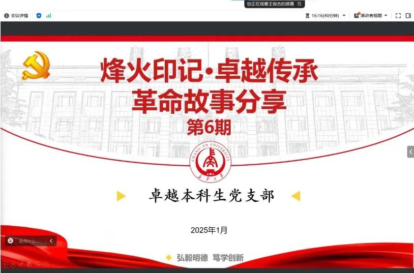 为缅怀革命先辈的丰功伟绩,传承红色精神,激励新时代青年不忘初心、牢记使命,1月27日,电控学院卓越本科生党支部在线上成功举办了“烽火印记,卓越传承”革命故事分享会(第6期)。本次分享会吸引了卓越党支部全体师生的热情参与,大家共同回顾了十大元帅之一朱德同志的烽火历程,深刻体会了他在艰苦岁月中不畏牺牲、勇往直前的崇高精神。