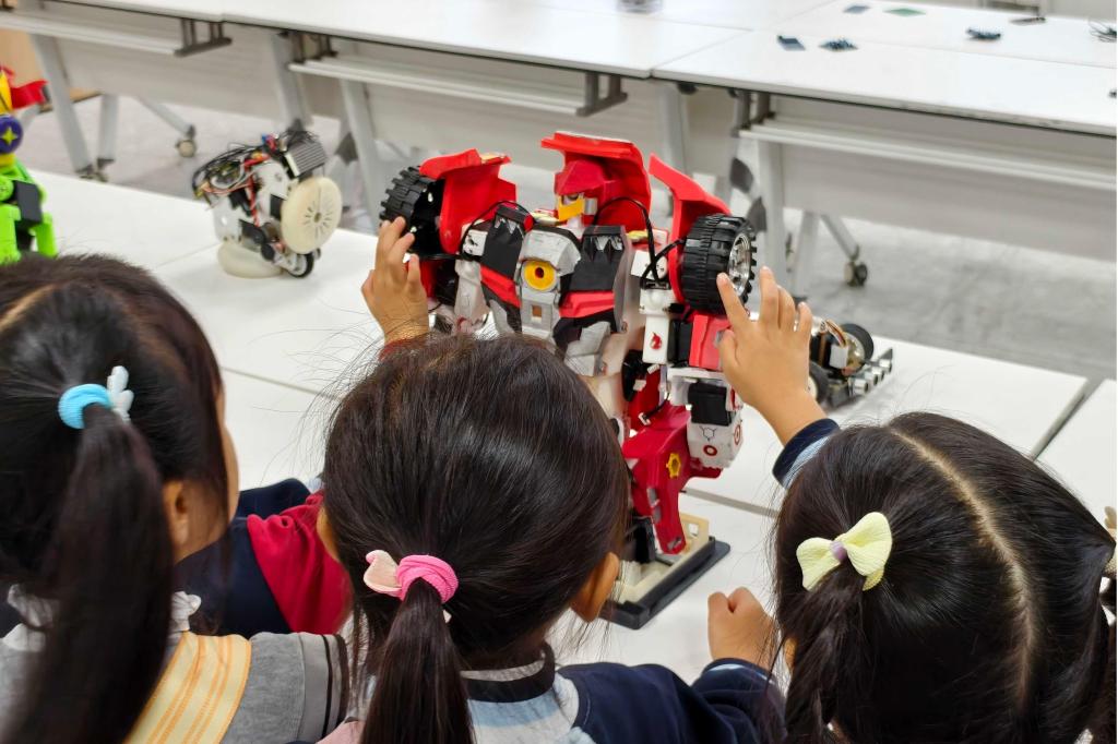 在机器人展区,志愿者借助六自由度机械臂与视觉识别机器人,讲解“舵机-连杆-末端执行器”的仿生对应关系,并通过“学机器人挥手”互动游戏,引导幼儿认识“感知-决策-动作”闭环。