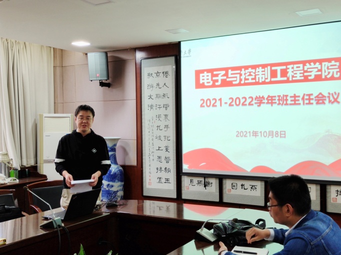 为推动班主任队伍建设,促进班主任育人作用充分发挥,进一步提高班主任工作针对性和实效性,电控学院于2021年10月8日下午在南校区学术交流中心第五会议室召开2021-2022学年班主任工作会议。全体学院领导班子成员、学办辅导员、各年级班主任及思政班主任参加会议,会议由院党委副书记赵丹主持。