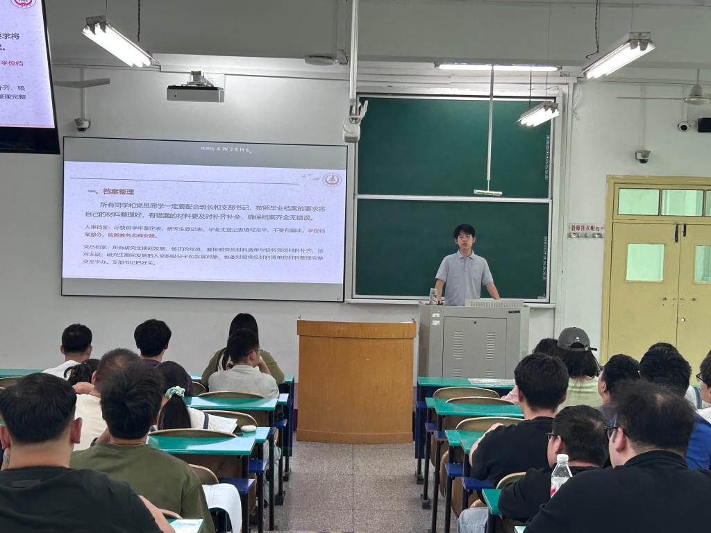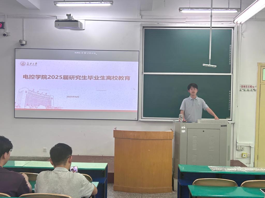 为扎实有效做好2025届毕业生离校教育工作,6月6日中午,电控学院在南校区北院b281教室召开2025届研究生毕业生离校教育大会,毕业班辅导员王佩佩主讲,2025届全体毕业研究生参加。