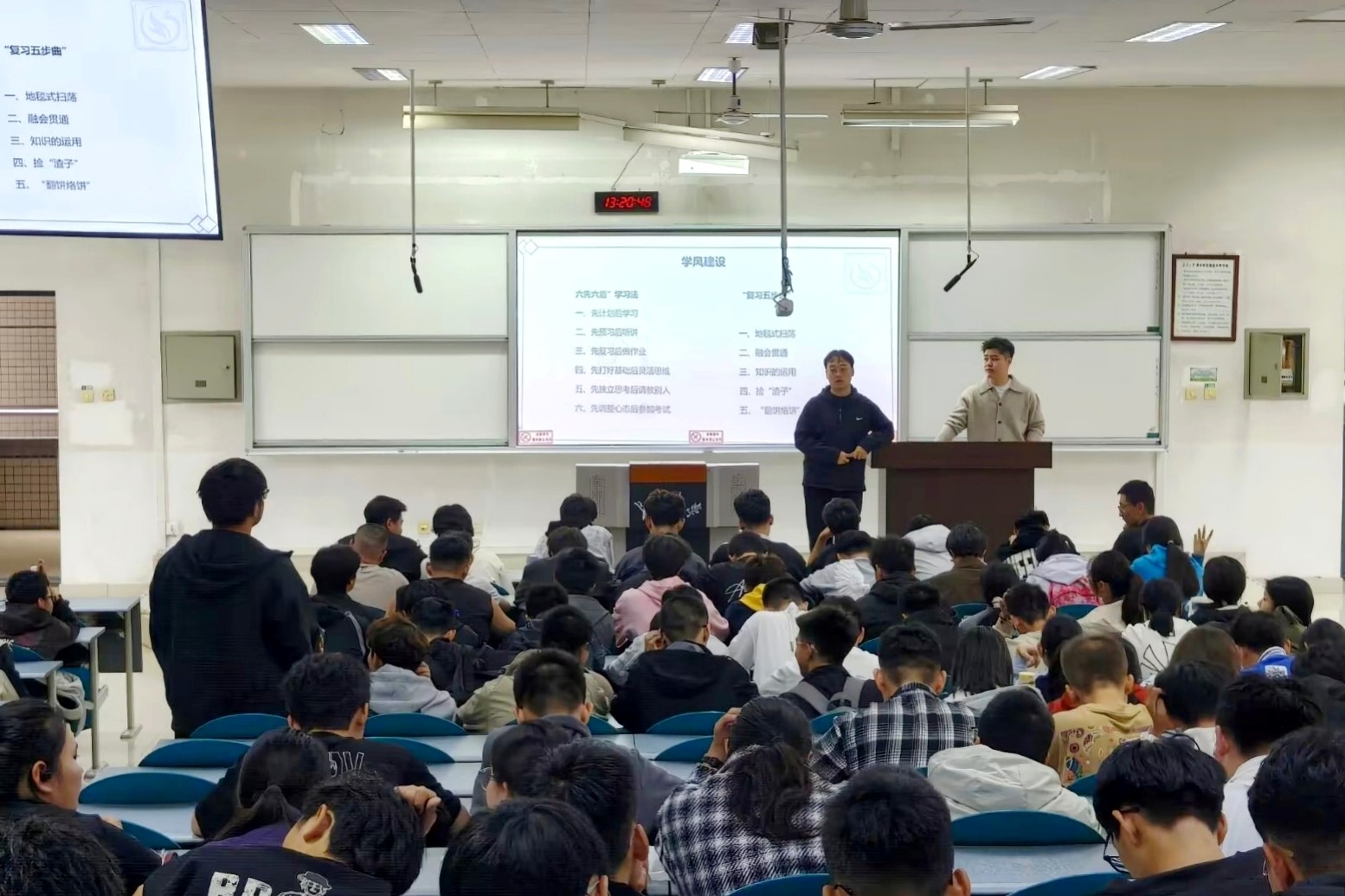 班会围绕“学风建设”主题,通过“木桶定律”与“长短腿凳定律”等生动比喻,引导学生理解个人发展与集体协作的密切关系,强调补齐短板、协同进步的重要性。内容涵盖班风与学风的内涵阐释,深入剖析了当前学风中存在的主要问题,包括学习目标模糊、方法不当、动力不足及时间管理不善等。班会还重点提出了“尊重、信任、理解、团结”的班级建设理念,以及“深思、乐学、团结、进取”的八字班风目标,并分享了“六先六后”学习法与“复习五步曲”等实用策略,助力新生掌握科学学习方法。在互动环节,同学们通过自我反思与彼此欣赏,进一步增强了班级认同感和凝聚力。