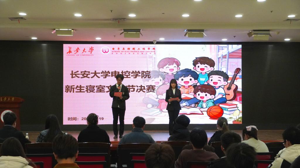 电控学院学生会于10月15日至11月2日开展“寓”见青春,“宿”造梦想——宿舍文化节系列活动。经过初赛、线上投票等环节,12个宿舍脱颖而出,决赛于11月19日晚在长安文化艺术中心三楼多功能厅举行。学院党委副书记高婷婷,团委副书记胡佳瑞,2025级本科生辅导员孙超、吴耀东及学生会主席团成员出席了决赛活动。活动由秦瑞盈和石中玉主持。
