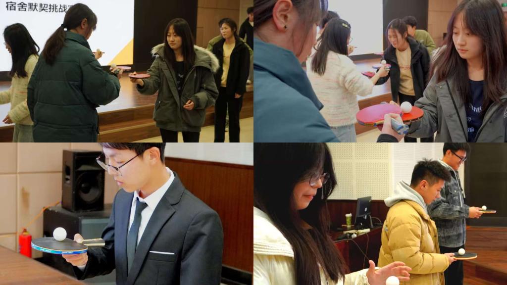 在宿舍默契环节——“珠行万里”小游戏中,各参赛成员通过乒乓球拍将乒乓球送到指定位置,交接时乒乓球如有掉落,需重新开始,根据进球个数的高低评选“最佳默契奖”。现场参赛宿舍成员和观众们积极参与,情绪高涨,气氛热烈,肆意彰显青春活力。参赛成员用自己的行动与付出,深刻诠释了本次宿舍文化节“团结,互助,包容,个性”的鲜明主题。