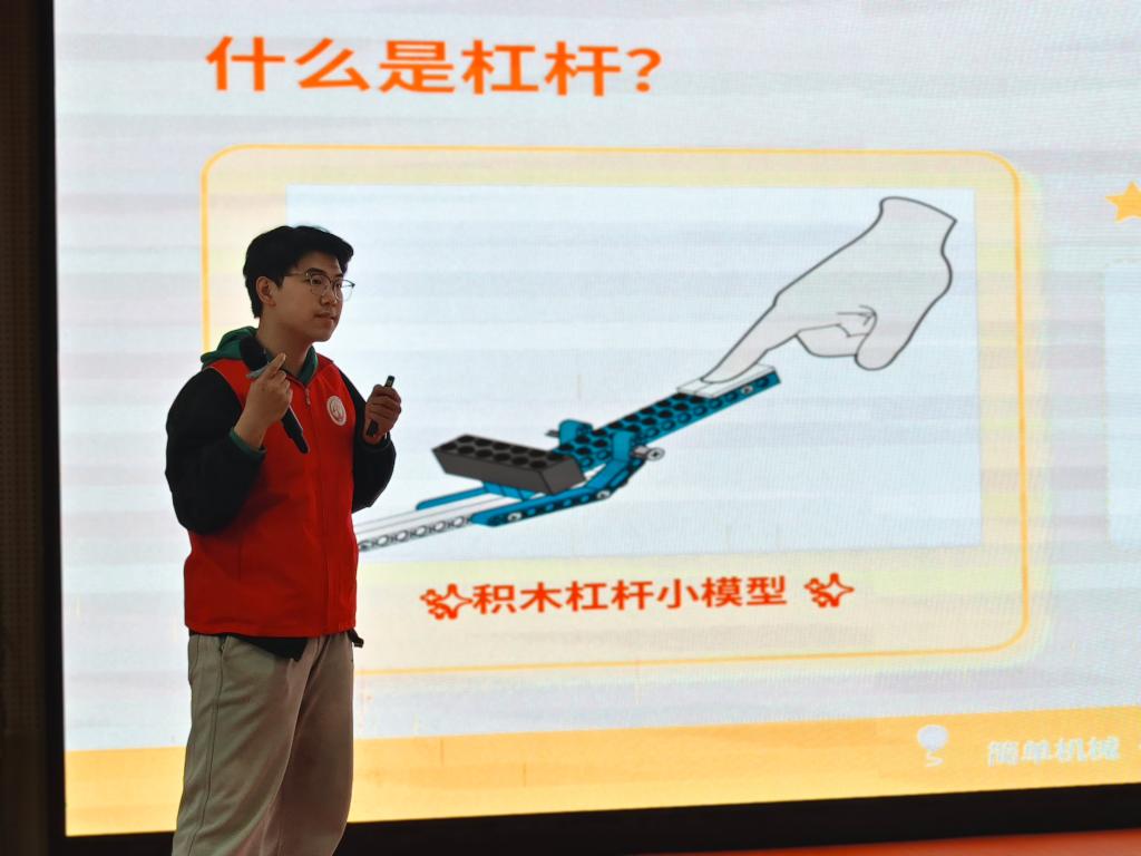 课堂以趣味互动导入,志愿者通过徒手搬积木与长条积木撬重物的直观对比,让孩子们清晰感受到“省力”与“费力”的差异,以生动提问点燃探索热情,顺势引出杠杆这一简单机械。