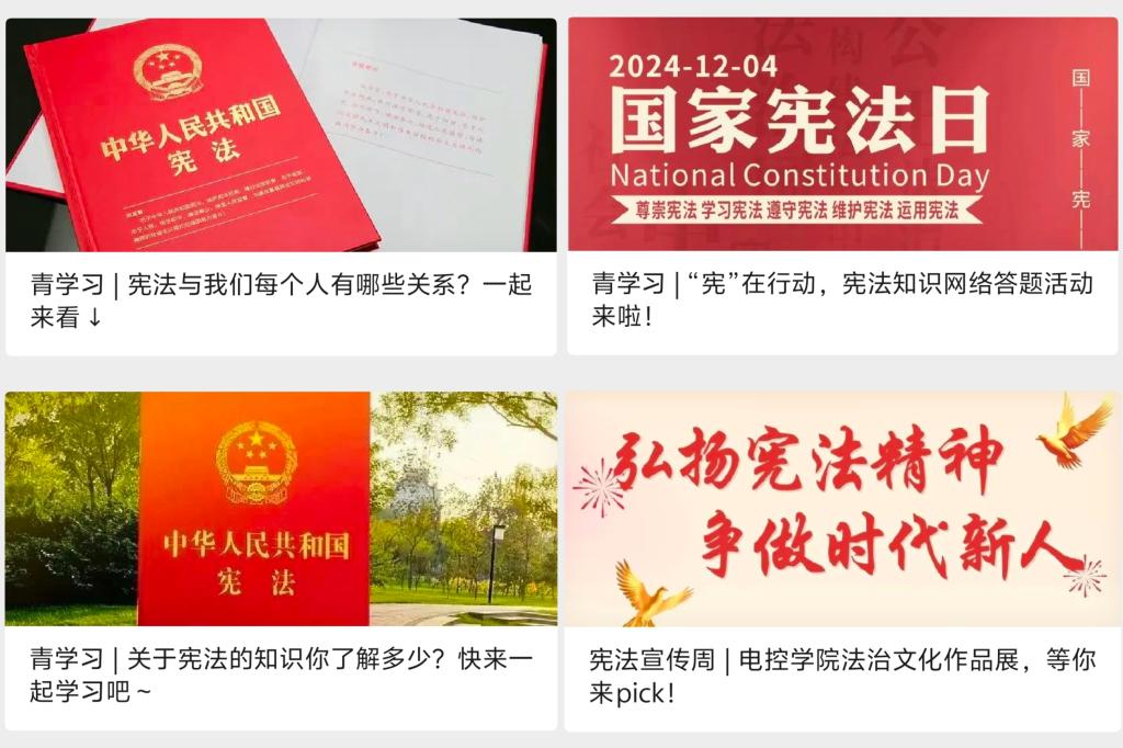 今年12月4日是第十一个国家宪法日,12月1日至7日是第七个“宪法宣传周”。为深入学习贯彻全国教育大会精神和习近平法治思想,大力弘扬宪法精神,扎实有效开展法治宣传教育,电控学院以“弘扬宪法精神·争做时代新人”为主题,聚焦思想引领、网络赋能、氛围营造,开展了“宪法宣传周”系列活动,为法治宣传教育聚合力、增动力、注活力。