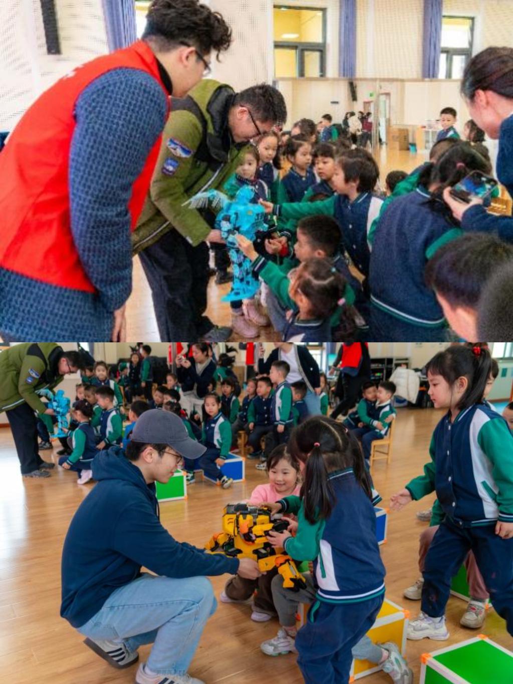 创意小机器人模型参观环节,孩子们观看、触摸机器人,与机器人亲密互动,在亲身体验机器人的魅力和风采的同时深刻感受来自科学技术的神奇力量。展示过程中,志愿者们耐心地解答孩子们提出的问题,鼓励他们勇于探索未知的世界。