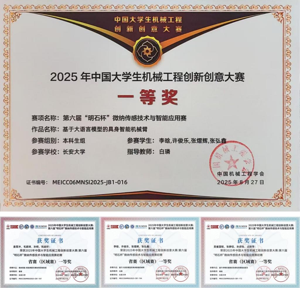 yl8858永利集团白璘副教授指导的李晗、许俊乐、张熠辉、张弘鑫团队以“基于大模型的具身智能机械臂”为主题开发了一款集成了大语言模型的智能机械臂。作品围绕人工智能技术发展现状调研、关键技术攻关和硬件系统搭建,形成了完整的实施路径,并提出了大语言模型前端部署等关键问题的解决方案。凭借突出的技术创新与工程实现能力,团队赢得了专家评委的一致高度评价,最终斩获全国一等奖。我院惠萌教授指导的袁霄冲团队和姚锐老师指导的吴崔国铭团队分获陕西省一等奖。